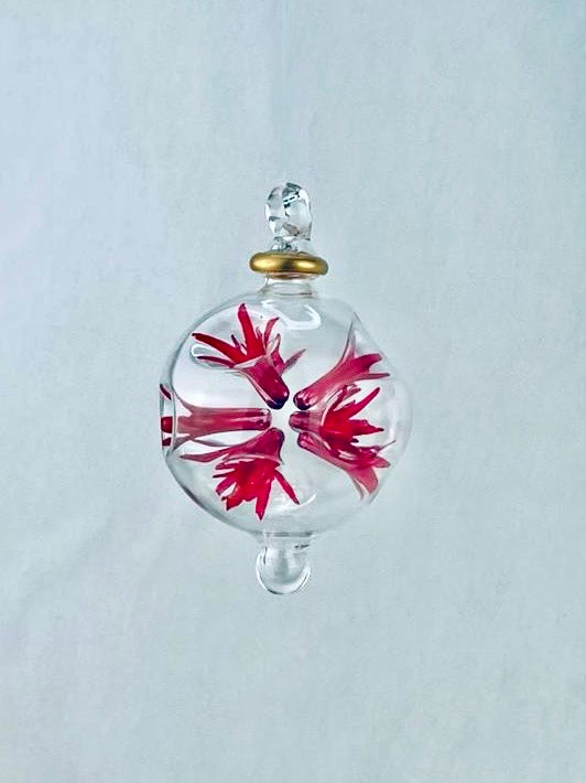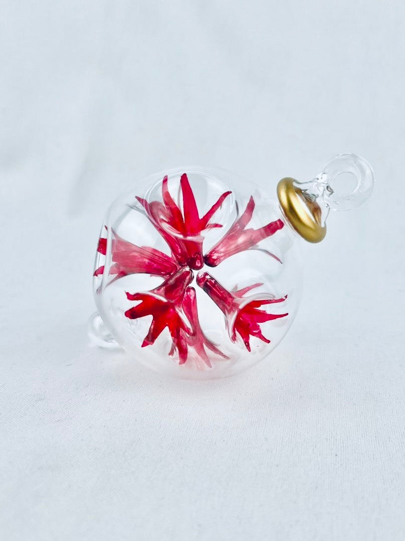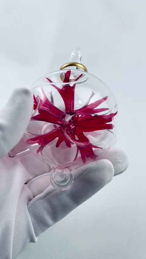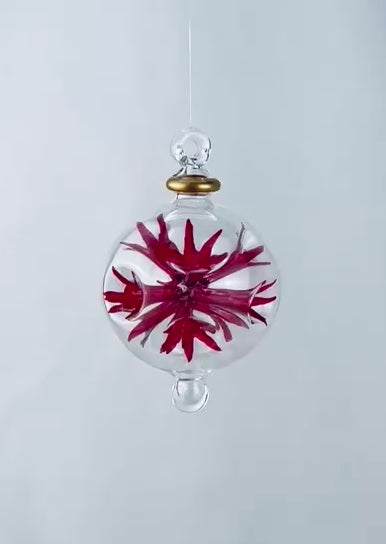 エジプトの職人が一つ一つ丁寧に手吹きで仕上げたオーナメントで、澄んだガラスの内部に炎のように広がる赤い花が立体的に表現されています。上部のゴールドカラーのリングがアクセントになり、ツリーライトを受けると内側からふんわりと光を放ち、落ち着いたロマンチックな雰囲気を演出します。